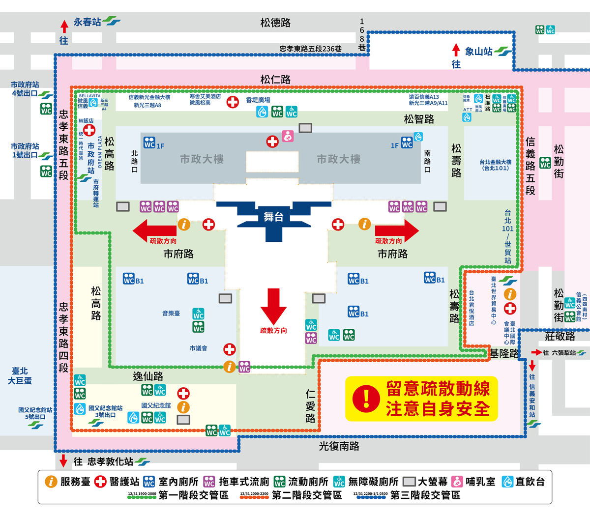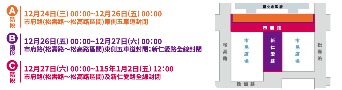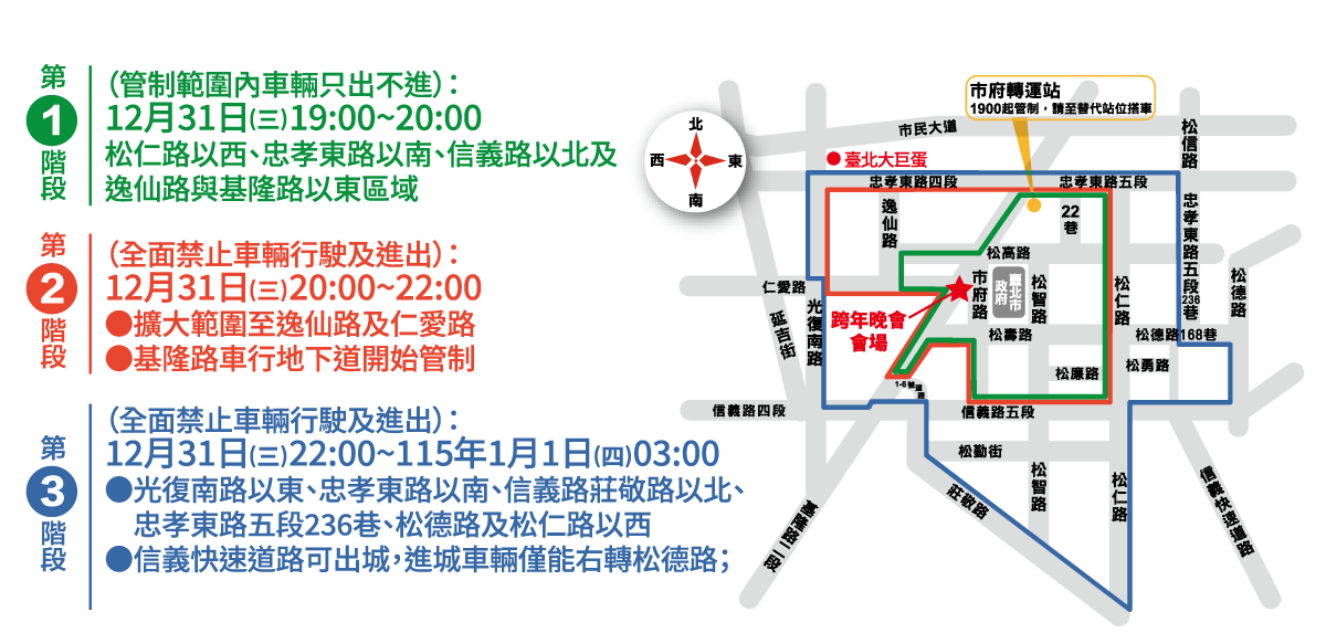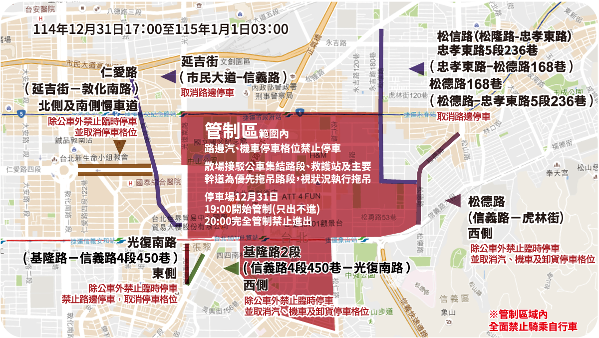 12月31日晚上信義計畫區舉辦「臺北最High新年城2026跨年晚會」活動,為因應舞台搭拆及當日活動人潮,自12月24日起進行交通管制,請行經該區域用路人注意管制措施。管制內容如下: