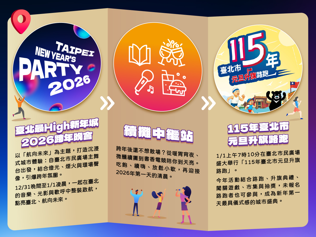 臺北市政府觀光傳播局主辦的「臺北最High新年城-2026跨年晚會」,將於114年12月31日在臺北市民廣場熱鬧登場。首波卡司公布Bii畢書盡與GENBLUE幻藍小熊獨家在臺北,還有高爾宣OSN、U:NUS陪伴民眾一同倒數迎接2026新年。觀傳局也攜手旅宿業者、旅行社合作推出住房優惠與跨年專屬限量遊程,就有機會獲得搖滾區入場證,邀請大家一同來臺北住宿遊玩!